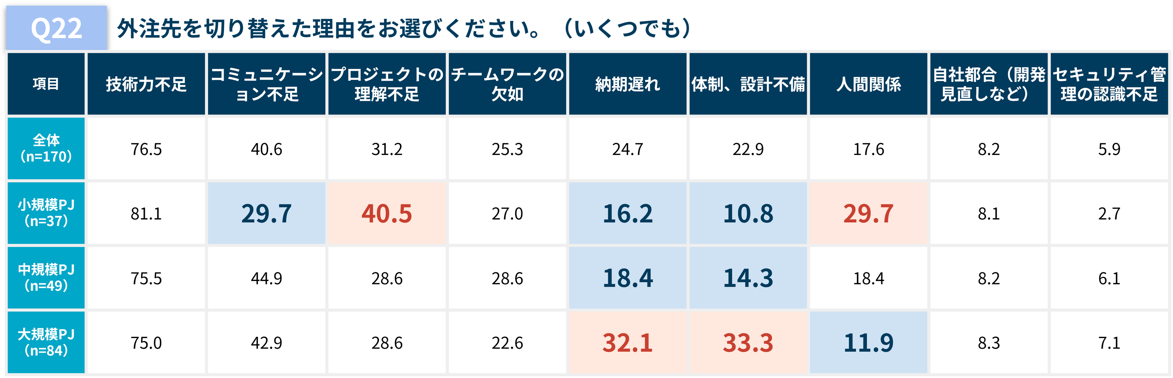 外注先を切り替えた理由をプロジェクト規模別に見ると、小規模PJでは、プロジェクトの理解不足や人間関係のトラブルが多く挙がりました。一方で大規模PJでは、納期遅れや体制の不安に伴う切り替えが多いことが分かりました。