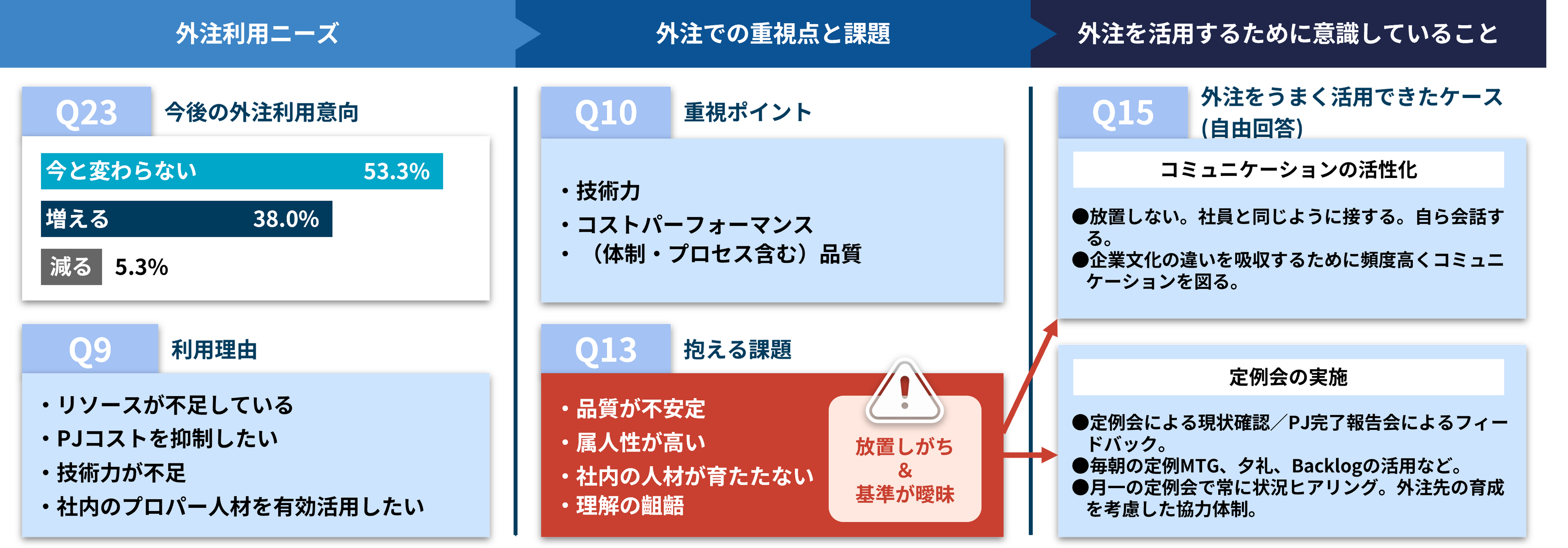 今後の外注利用意向は「今と変わらない」53.3%、「増える」38.0%と高水準でした。一方で、課題としては【品質のばらつき/担当者依存(属人性)/社内メンバーが育たない/要件・優先順位の理解齟齬】の4点が多く挙げられました。外注をうまく活用できたケースでは、「こまめなコミュニケーション」と「定例会の実施」が共通していました。
