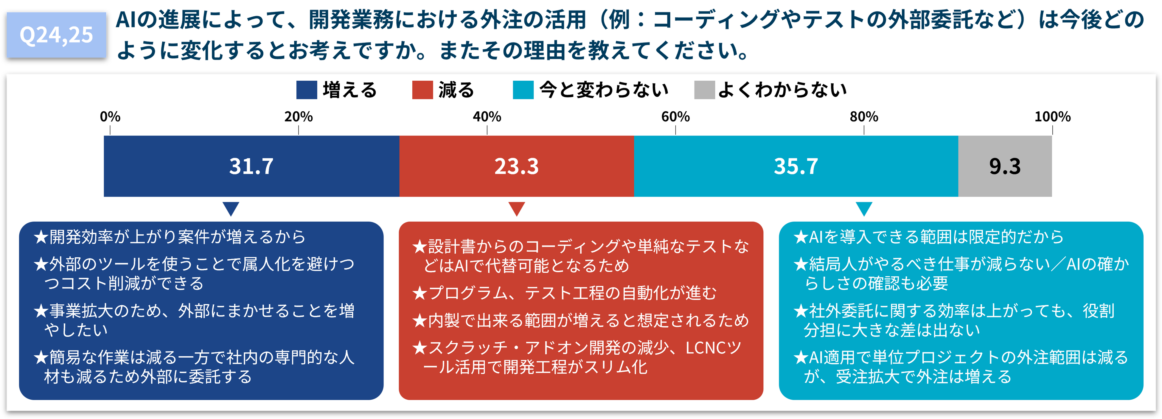 AIの進化に伴う外注利用頻度については、「増える」「減る」「今と変わらない」で意見が分かれました。開発の外注が増えると考えている人は、「開発効率の向上により案件数が増え、外注の活用も増える」と回答。一方で、減ると考えている人は、「開発工程がAIに代替され、内製化が進む」と答えています。