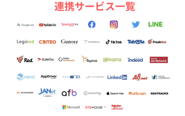 Google広告やYahoo!広告をはじめとする合計38の広告サービスと連携が可能で、広告データの収集・蓄積・レポート生成を自動化します。