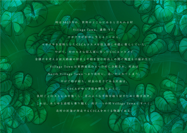 ブランド名である「VT」をモチーフにした世界のどこかにあると言われる村「Village Town」を舞台に、VTの代名詞でもあるツボクサ由来の成分「CICA」をめぐるストーリーが展開されます。