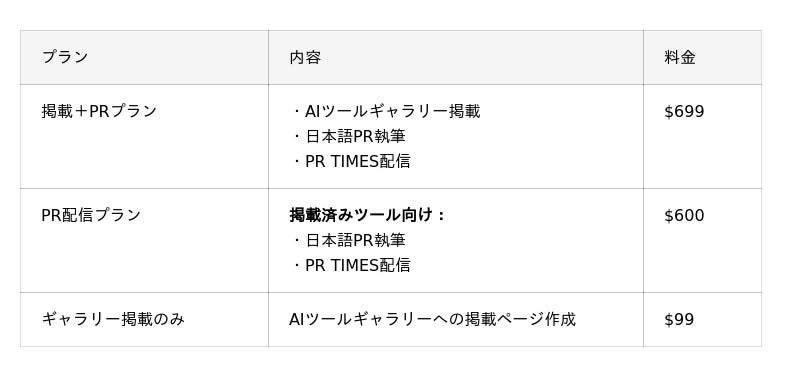 本プランは、AIツールギャラリーへの掲載とPR TIMES配信を組み合わせた、海外AI企業向けのPRサービスです。