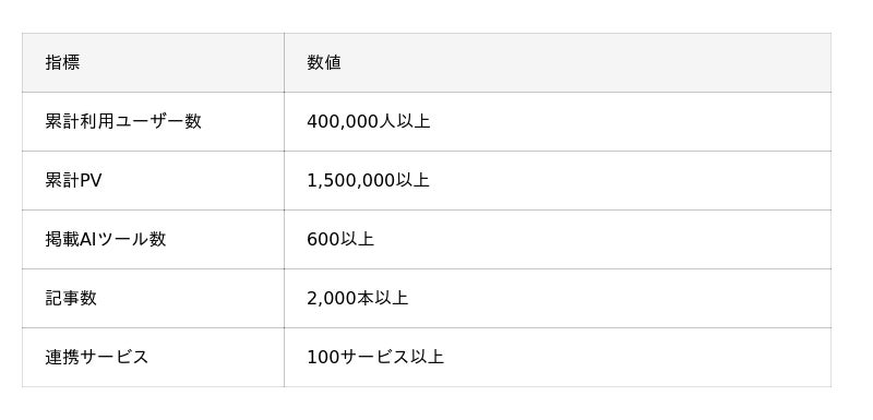 AIツールギャラリーは、2024年1月のサービス開始から2年で以下の実績を持つ日本最大級のAIメディアです。