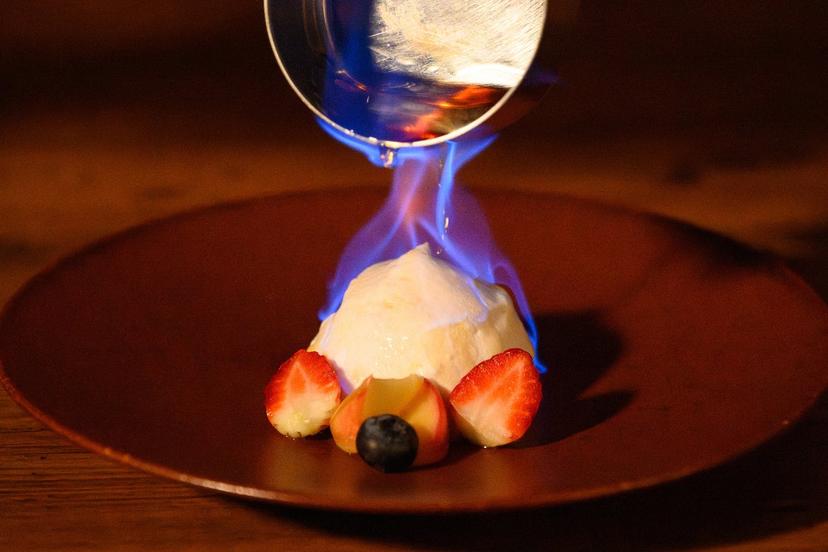 目の前で炎が上がる演出が楽しいワゴンサービス「フレア・フロマージュ」は、ひんやり冷たいレアチーズを真っ白なメレンゲで包み、香ばしい焼き色をつけて仕上げる、冬の夜にぴったりの贅沢な一皿。季節のフルーツとともに、心まで温まるひとときをお届けします。※土日祝限定