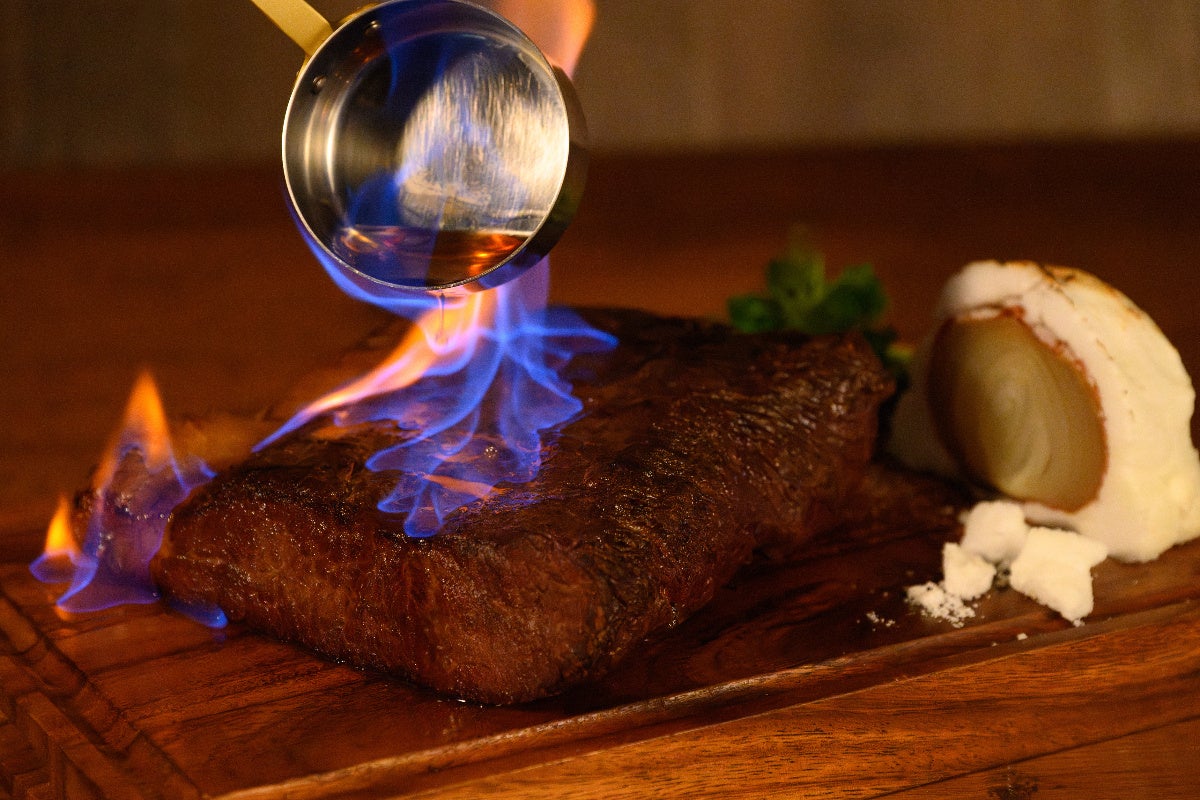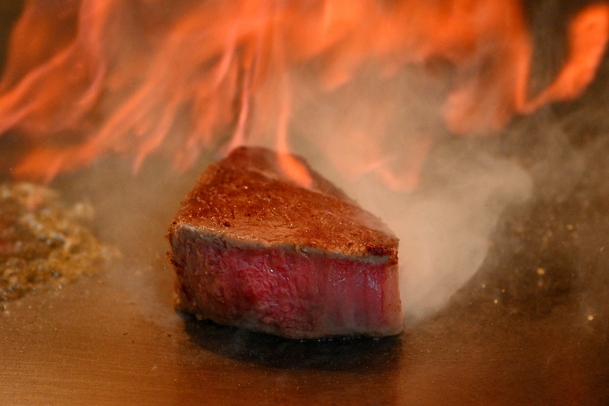 ・国産牛鉄板焼きフィレ100gまたはサーロイン120gフランベサービス秋田の肉味噌添え