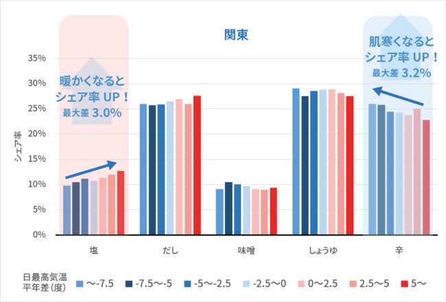 関東では、肌寒い日ほど辛味のシェア率が上がり気温差-7.5℃未満の日が最もシェア率が高く、気温差+5℃以上の日よりも3.2%高い結果となりました。一方、塩味は肌寒い日ほどシェア率が低くなる傾向が見えました。関西では、関東のようなはっきりした傾向が見えづらいですが、関東同様に、肌寒い日ほど辛味のシェア率が高くなり、塩味のシェア率が低くなる傾向が見えました。