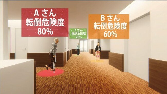 過去のデータから入院患者の転倒・転落リスクを分析し、分析結果をデジタルツインに重ね合わせて情報発信。看護師が当該情報を事前に確認することで事故防止につなげる。