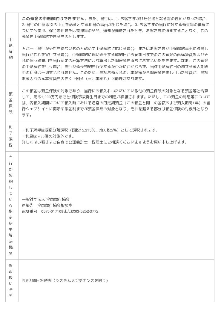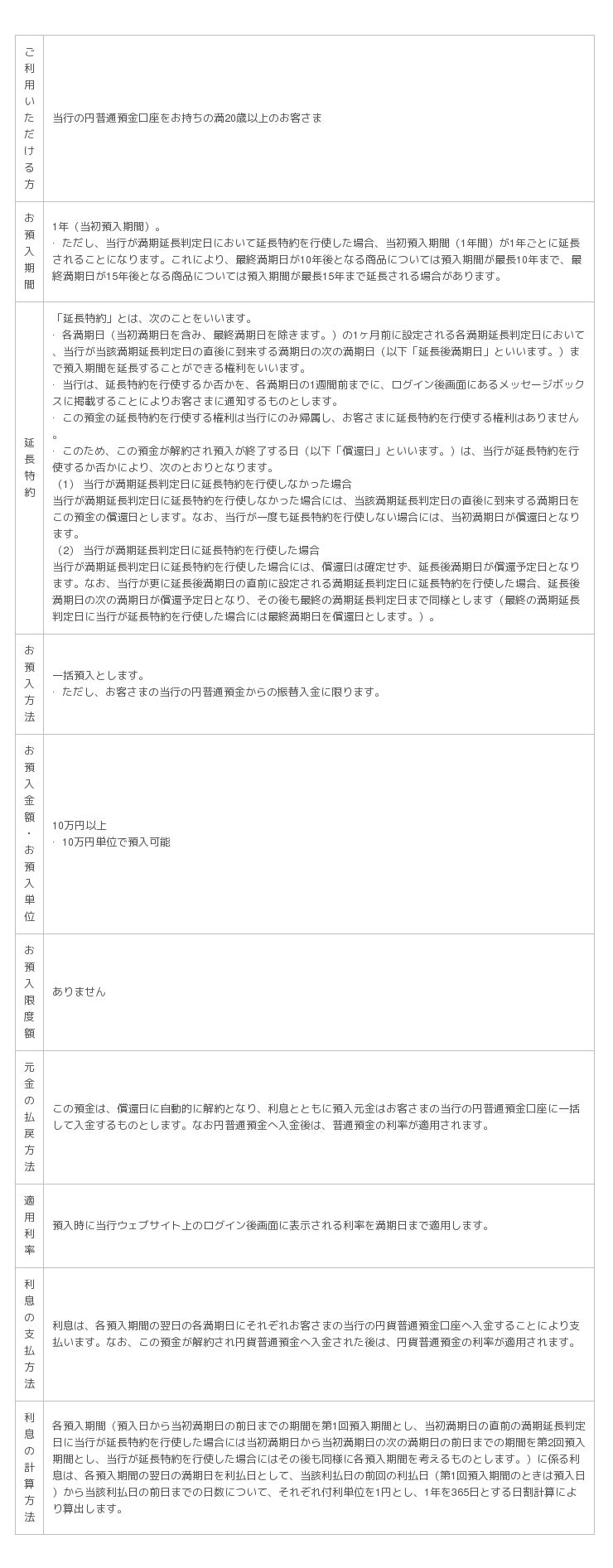 なお、この預金の預入期間は最短1年間ですが、当行の判断により1年毎に延長し、最長15年間まで延長する可能性があります。商品内容を十分にご理解の上、必ず最終的な満期日まで利用する予定の無い余裕資金でお預入れいただく必要があります。