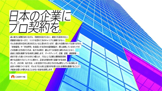 私たちが運営する『キャリーミー』は “ビジネス界にもプロ契約を”というコンセプトのもと、個人が成果にコミットして業務委託契約で働く「プロ契約」の導入・活用を支援するサービスです。