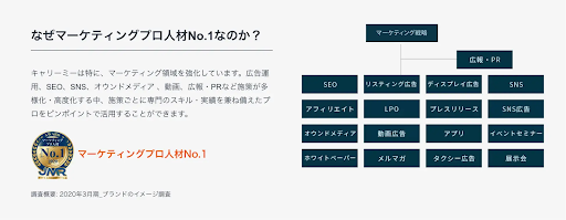 特にマーケティング領域を強みとしており、広告運用、SNS、SEO、オウンドメディア 、動画、広報・PRなど施策が多様化、高度化する中で、スキルと実績の豊富なマーケティングプロ人材を戦略から実務まで必要なボリュームでアサインすることができます。