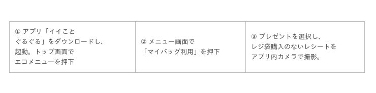 下記応募等の流れのとおり、1.市内のコンビニエンストアでマイバッグを利用してお買い物する、2.環境局アプリ「イイことぐるぐる」をダウンロードする、3.アプリ内の専用ページでレジ袋購入のないレシートを読み込むことで簡単に応募が完了します。