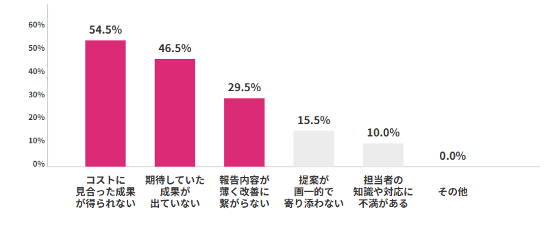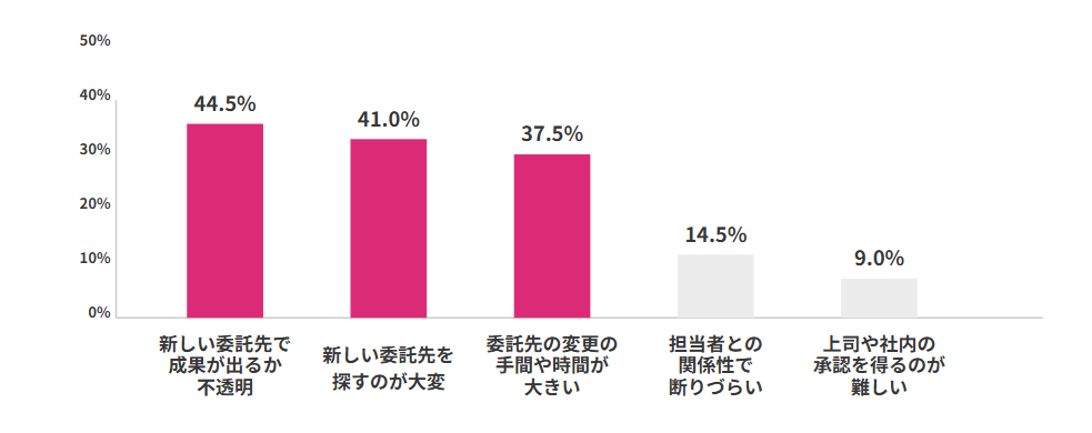 特に注目すべきは、「次も成果が出るか分からない」というリスクへの不安です。現状に不満はあるものの、変更によってさらに悪化する可能性を恐れ、動けずにいる企業の姿が浮かび上がってきました。