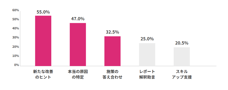 - 施策が成果に繋がらない「本当の原因」を特定してほしい(47.0%)約半数が、問題の根本原因の特定を期待しています。表面的な分析ではなく、深い洞察を求めている姿勢が伺えます。