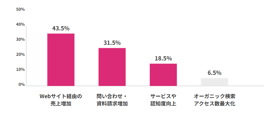 注目すべきは、75%の企業が売上やリード獲得といった「ビジネス成果」を重視している点です。単なる順位改善やアクセス数増加ではなく、ビジネスインパクトを求める企業の姿勢が明確に表れています。