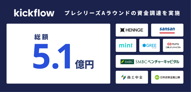 株式会社kickflow(※1)は、プレシリーズAラウンドとして、HENNGE株式会社、Sansan株式会社、mint、グリーベンチャーズ、三菱UFJキャピタル、SMBCベンチャーキャピタル、商工組合中央金庫、日本政策金融公庫よりデット・エクイティを含めて総額5.1億円の資金調達を実施したことをお知らせいたします。