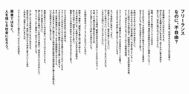 そこで、当社は、自由を手に入れるために選択をしたフリーランスが、さまざまな事情で不自由に縛られてしまっていることへの問題提起を目的としたメッセージを発信することにしました。