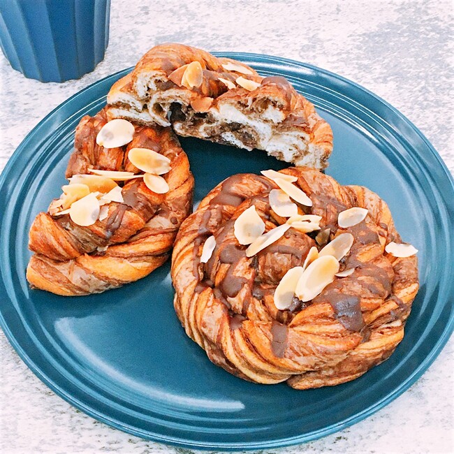 チョコデニッシュ生地を巻いて焼きあげ、線がけチョコにローストしたスライスアーモンドを