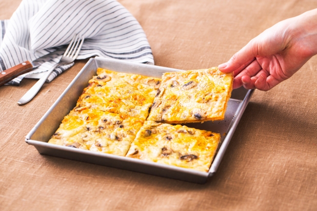トッピングした具の美味しさがじゅわっと染み込んだ表面から、裏面にかけてのしみしみさくさく生地の食感が楽しいパイです。おやつにも、軽いお食事にもおすすめの一品。