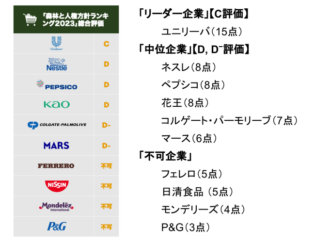 ユニリーバがトップ、P&G最下位、日清食品は改善するも取り組み遅れ〜大手消費財企業、森林破壊と人権侵害防止を公約するも阻止できず〜 グローバル消費財企業10社の森林及び人権方針を評価