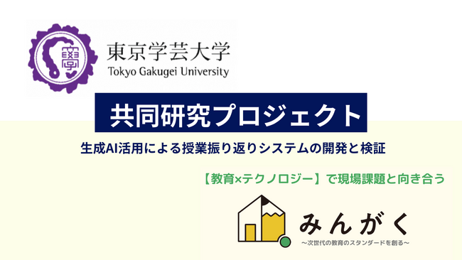 教育×生成AIをテーマに、教育サービス開発を手掛ける株式会社みんがく(本社:東京都目?区、代表取締役:佐藤 雄太)は、国立大学法人東京学芸大学(東京都小金井市 学長:國分 充、以下「東京学芸大学」)と教育現場における生成AI活用に関する共同研究を行うことを発表しました。