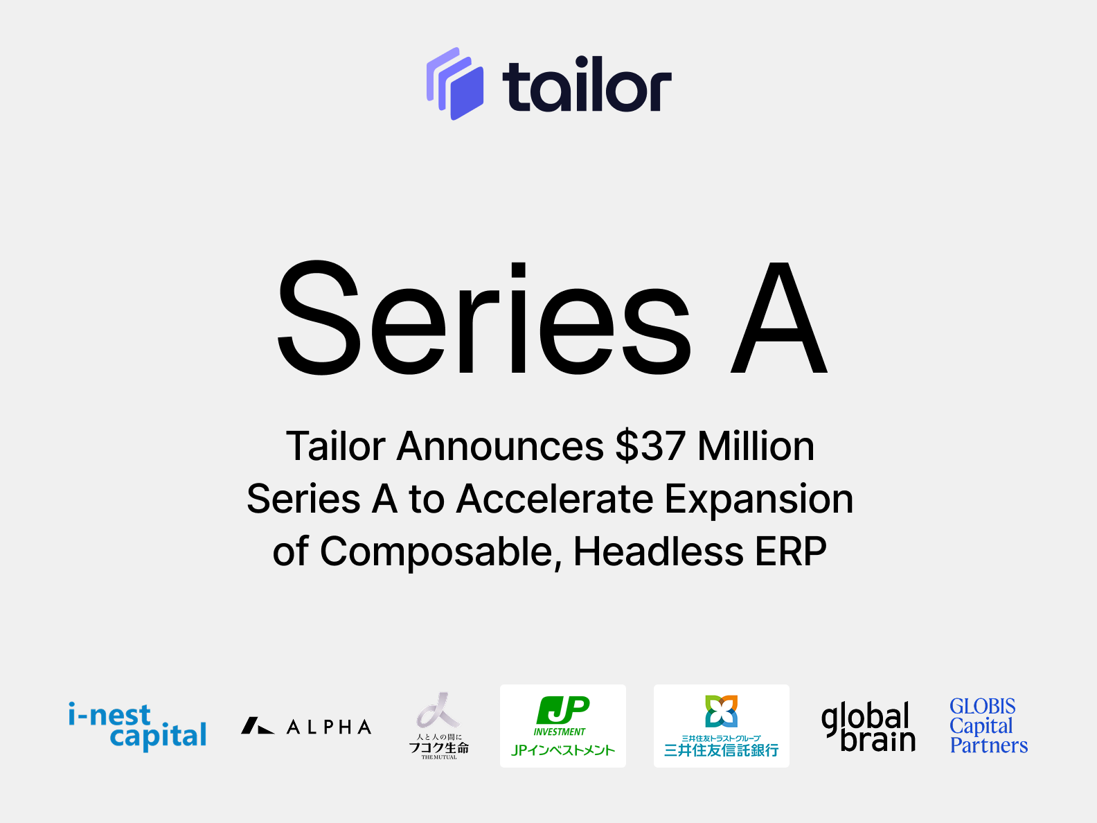 ヘッドレスERPプラットフォームを提供するTailor Technologies, Inc.(本社:米国カリフォルニア州サンフランシスコ、代表:柴田陽)は、シリーズAの追加クローズを実施し、累計3,700万米ドル(約55億円)の資金調達をもってシリーズAラウンドの調達を完了したことを発表しました。今回新たに、独立系VCのi-nest capitalおよびALPHA、金融機関系VCのフコクCVCファンド、グロース投資家のJPインベストメント(※)ならびに、大手金融機関の三井住友信託銀行が出資。シードラウンドからの既存投資家であるグローバル・ブレインおよびグロービス・キャピタル・パートナーズも追加出資を行いました。