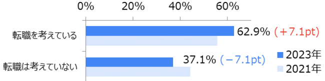 転職を考えている外国人社員は2021年から7.1pt増え、62.9%となりました。Q8で転職経験者の割合が増えていることがわかりましたが、現在転職を考えている外国人社員の割合も増加傾向にあるようです。