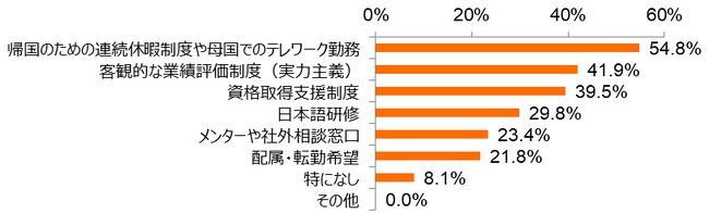 半数以上(54.8%)が「帰国のための連続休暇制度や母国でのテレワーク勤務」と回答。次いで、「客観的な業績評価制度(実力主義)」(41.9%)、「資格取得支援制度」(39.5%)という結果になりました。Q4で、日本企業で働いて疑問に思うこと・改善してほしいこと(自由回答)を聞いたところ、「昇進を年功序列から実力主義にシフトしてほしい」や、「外国人に対しての評価を改善してほしい。日本人と比べて言葉の壁もあり、同じ基準で評価されるとなかなか昇給ができない」といった意見もあり、客観的な評価制度を求める外国人社員が多いことがわかりました。