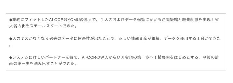 AI-OCRは、アナログ文化を廃止しDXを実現、事業を拡大していく目的で導入しました。そのためには、正しいデータをいかに集められるかです。今この基盤ができました。これからはデータを活用して分析し、お客様に提案をしていくことが、我々の事業が成長していくために重要なことだと考えています。