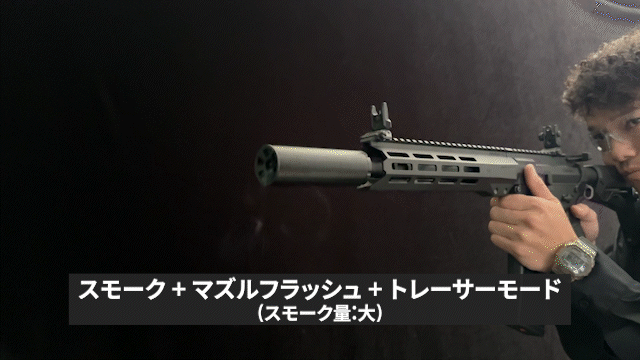 外観だけでなく中身も本格仕様で、「スモークのみ」「マズルフラッシュ」「トレーサー」機能を自由に組み合わせ組み合わせ可能。