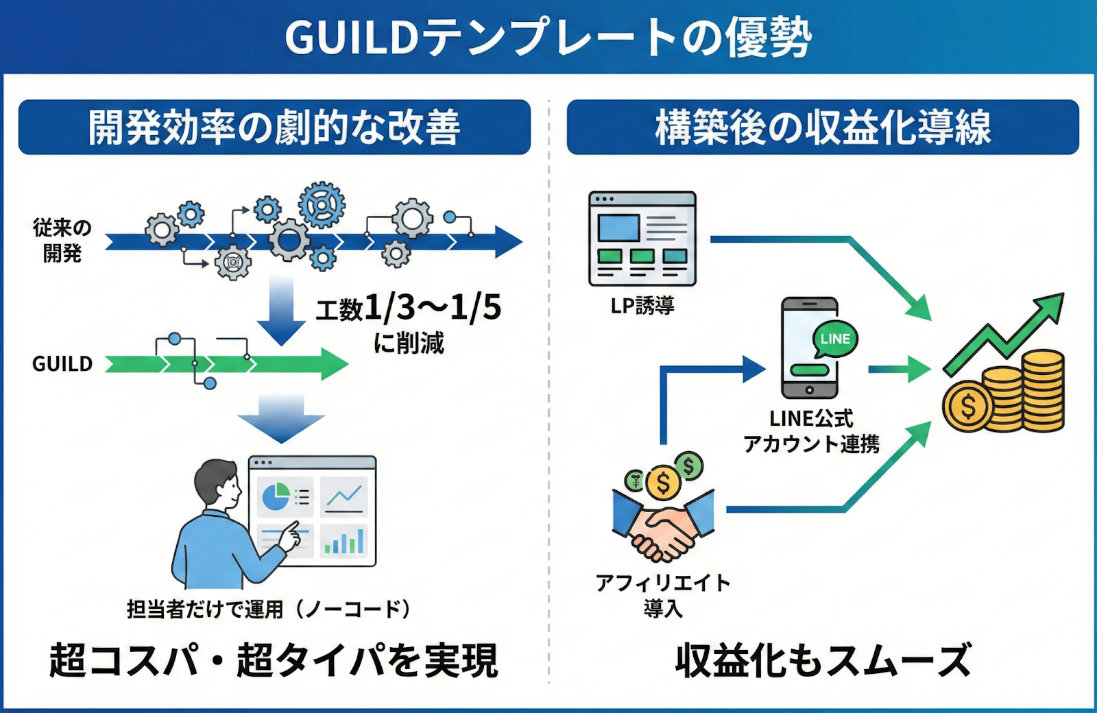 [画像3: https://prcdn.freetls.fastly.net/release_image/103459/28/103459-28-46ec73416cee7050a51b8a1a88aca258-1600x1040.png?width=536&quality=85%2C75&format=jpeg&auto=webp&fit=bounds&bg-color=fff ]資料内に示されている通り、GUILDのテンプレートは開発工数を1/3〜1/5に削減し、担当者だけで運用できる構造により“超コスパ・超タイパ”を実現します。