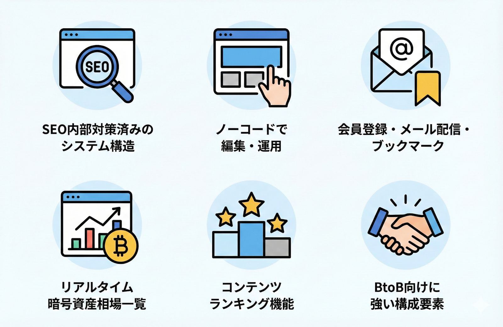 本テンプレートは、CoinNinjaの実運用データを元に「成果の出やすい構造」「検索・UI・内部導線」を最適化したうえで、企業が即運用できる形にパッケージ化したものです。