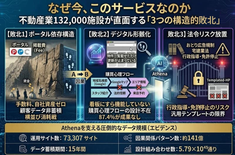 ■ なぜ今、このサービスなのか──不動産業132,000施設が直面する「3つの構造的敗北」