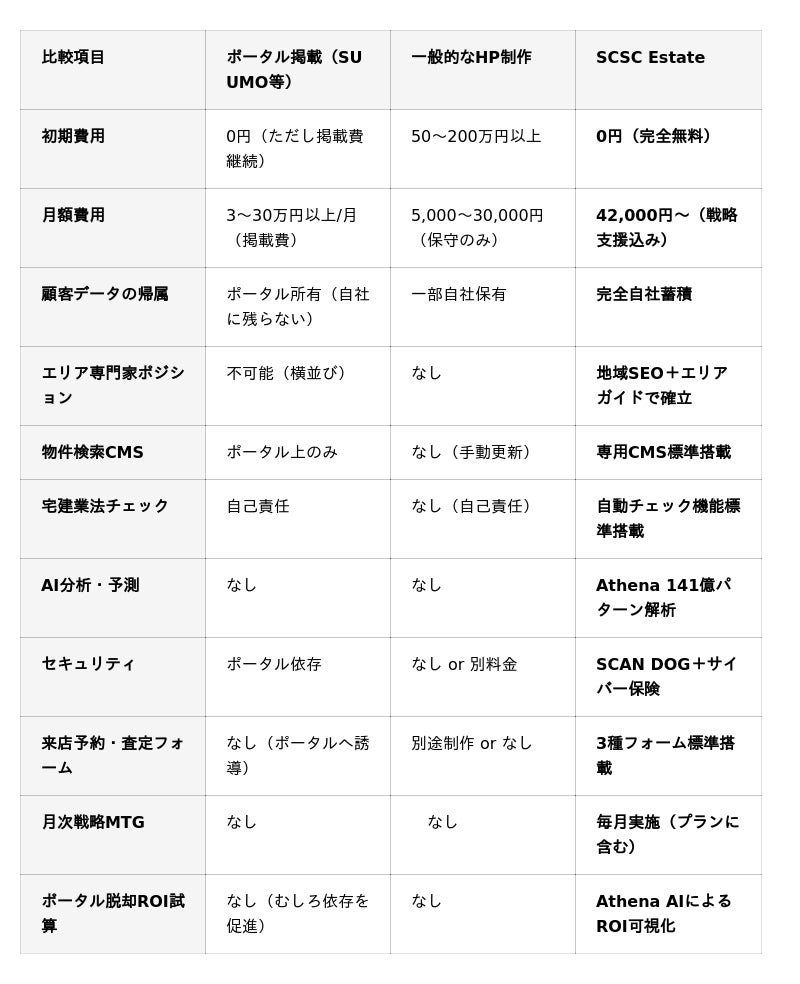 ■ 徹底比較──ポータル掲載 vs 一般HP制作 vs SCSC Estate