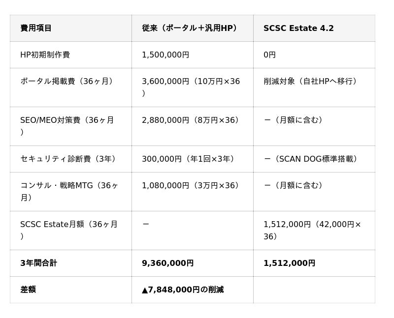 「安いから選ぶ」のではありません。「ポータルに払い続けるコストを自社資産の構築に振り向けることで、3年後・5年後の経営基盤が根本的に変わる」──それがSCSC Estateの費用構造です。[表4: https://prtimes.jp/data/corp/60260/table/29_4_609942e73eeda4ba79759f7c977bb917.jpg?v=202603110345 ]