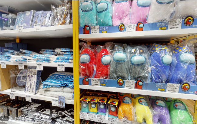 「マインクラフト」のグッズは、クリーパーのぬいぐるみや顔のライト、たいまつライト、ダイヤモンドの剣などゲームの世界感あるグッズが並び、「AMONG US」のぬいぐるみも揃っています。