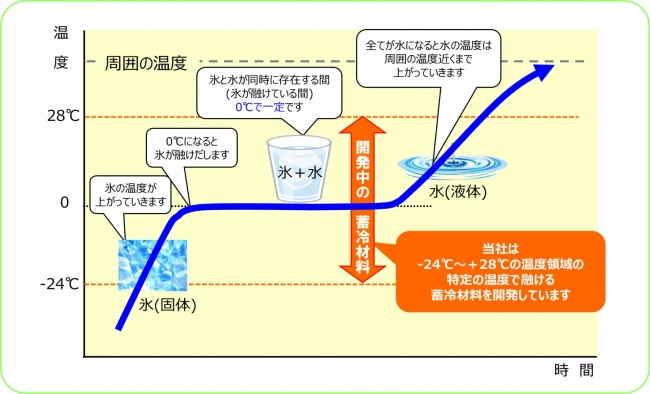 ※2 本「蓄冷材料」は特定の温度で融け、固体から液体に変化します。この時、周囲の熱を吸収することにより、材料そのものだけでなく、その周囲の空気や触れている対象物を特定の温度で保持する機能を有します。保持できる温度や時間は、材料の使用量や使用条件によって異なります。