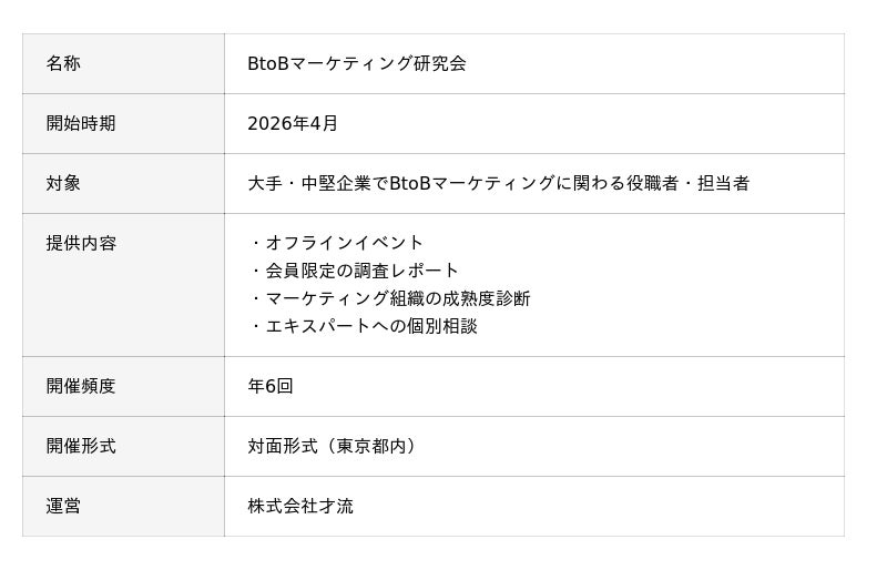 株式会社才流(本社:東京都中央区、代表取締役社長:栗原 康太)は、2026年4月より、大手・中堅企業のBtoBマーケティング組織を対象とした研究会「BtoBマーケティング研究会」を開設します。会員となる企業様の募集も開始しましたので、あわせてお知らせいたします。