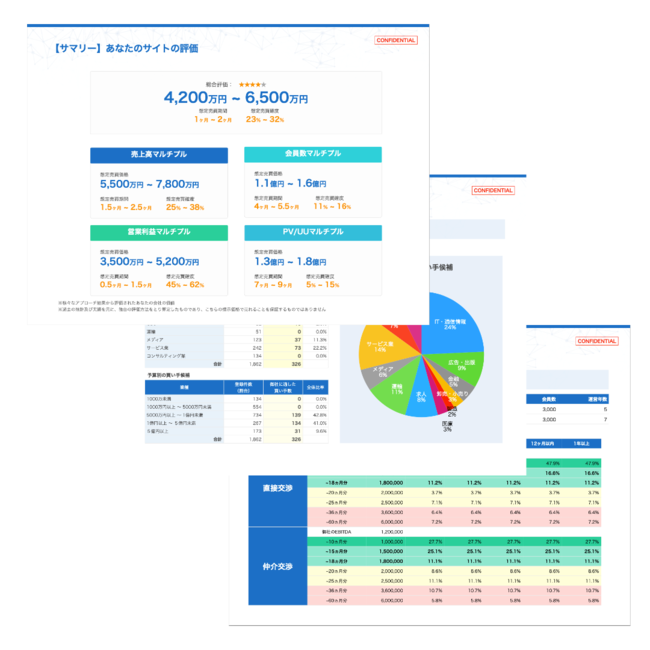当社のミッションは、可視化された価値を元にそれぞれの企業の強みが評価され、企業価値向上につながる世界を作ることです。今後はサイト解析情報及び、サイト売却までのプロセスが一目で分かる多彩な評価レポートの出力機能の追加、さらに様々な評価方法に対応できるように、活用する統計データの拡充をしてまいります。
