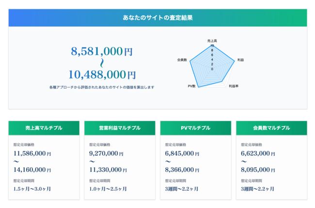 売上高マルチプル・利益マルチプル・会員数マルチプル・PVマルチプル等のアプローチの中から、適切な算定方法によりご自身のサイトの価値がAI価値算定されます。