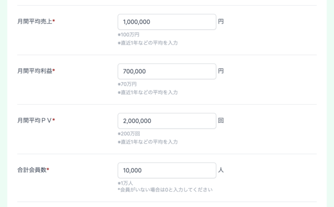 サイトジャンル・月間売上・月間PV/UU・会員数・運用歴など、AI査定を行うためのサイト情報を入力します。