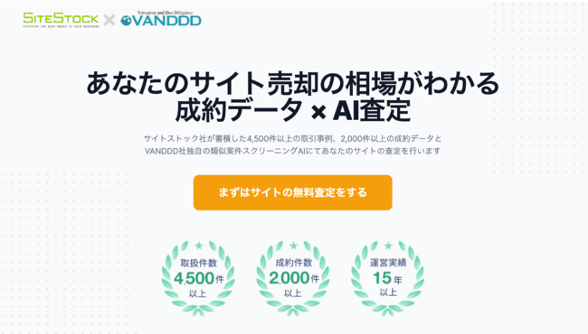 この業務提携に伴い、VANDDD社が独自に開発した類似案件スクリーニングツール「スコアリングAI」を応用し、サイトストック社が保有する2000件以上のWEBサイト売買取引の実データを元にしたWebサイト売買マーケットで業界初となる査定ツール「サイトAI査定」の提供を開始します。