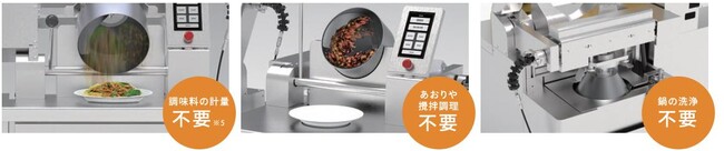 食材の攪拌、加熱、調理後のフライパンの洗浄までの一連の動作を自動化するロボットです。これにより、人手不足の外食産業や大量調理施設の省人化を推進し、且つ、味のブレを無くします。