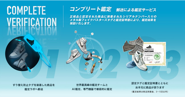 郵送による鑑定サービスで、鑑定チーム、AI鑑定、専門機器を駆使して、最高精度の鑑定を実現しています。正規品と認定された商品に装着されたシリアルナンバー入りのメタル製フェイクバスターズタグと鑑定証明書により、鑑定結果を保証いたします。商品到着後、3〜5日以内に鑑定結果をお伝えします。1点あたり9,900円(税込)から