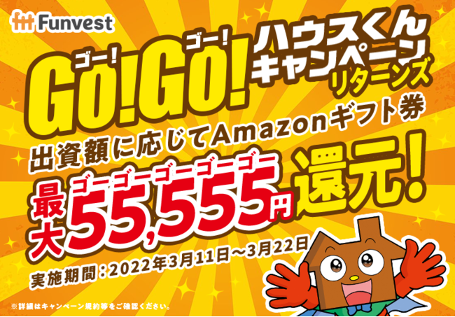 また、本ファンドに投資していただいた投資家の皆様を対象として、出資額に応じて最大55,555円分のAmazonギフト券をプレゼントする「Go!Go!ハウスくんキャンペーン リターンズ」も併せて実施いたします。