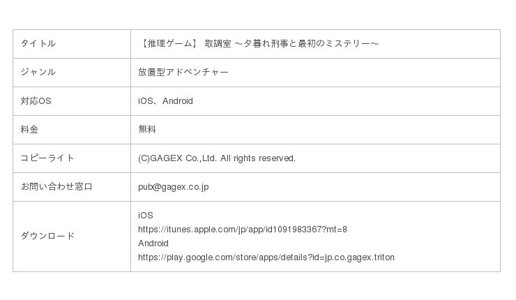 株式会社GAGEX(ガジェックス)(本社:東京都墨田区、代表取締役:井村 剣介)は、本日、スマートフォン向けアプリ、「【推理ゲーム】取調室 〜夕暮れ刑事と最初のミステリー〜」を公開いたしました。