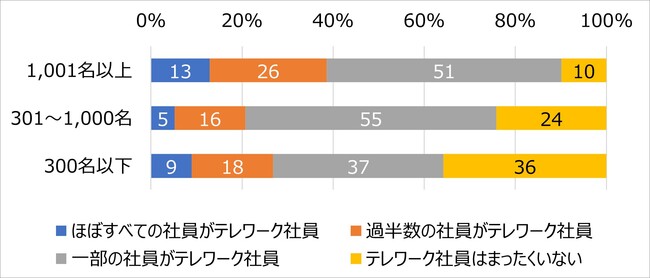 「ほぼすべて/過半数の社員がテレワーク社員」の割合を見ると、大企業では39%と4割に上り、中堅企業では21%、中小企業では27%となっている。企業規模が大きいほどテレワーク社員の割合が高く、逆に企業規模が小さいほど「テレワーク社員はまったくいない」の割合は高くなっている。中小企業での「テレワーク社員はまったくいない」の割合は36%と4割近くにも上る。