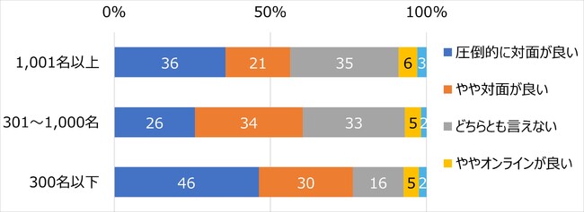 中小企業では「圧倒的に対面が良い」が46%と半数近くに上り、「対面が良い派」は76%と8割近くにも上っている。大企業や中堅企業と比較して、中小企業では対面での社内コミュニケーションが主体であるという実態に即した所感であることがうかがえる。