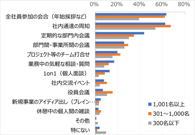 大企業では「全社員参加の会合(年始挨拶など)」が最多で63%、次いで「社内通達の周知」が62%と6割を超えている。中堅・中小企業でもこれら2項目が上位に並び、「社内通達の周知」が最多でそれぞれ67%、54%となり、「全社員参加の会合(年始挨拶など)」が62%、39%などとなっている。双方向のコミュニケーションではなく、情報伝達やフォーマルな会合の場については、オンラインでも問題なく機能が果たされ、移動を伴う必要がなくなり利便性も高まるというメリットがあるのだろう。