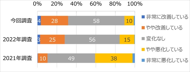 今回調査で「改善している派」と「悪化している派」の割合を比較すると、22ポイント差で「改善している派」の割合が高くなっており、全体としては改善傾向にあることがうかがえる。