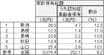 最後に、都道府県別に家計保有資産に占める認知症高齢者保有の資産割合を算出しています。金融資産では、東京都は6.6%と2番目に少ない水準である一方、新潟県が13.9%と東京都の2倍以上の水準となっています。また、不動産でみると、東京都は認知症高齢者が保有する不動産が群を抜いていることもあり高い水準となっていますが、金融資産と不動産の総額では金融資産での割合が大きく、新潟県が最大の割合となっています。新潟県は高齢者比率が岩手県などと並んで高い上、高齢層が保有す金融資産額が相対的に大きいことが要因と推測されます。